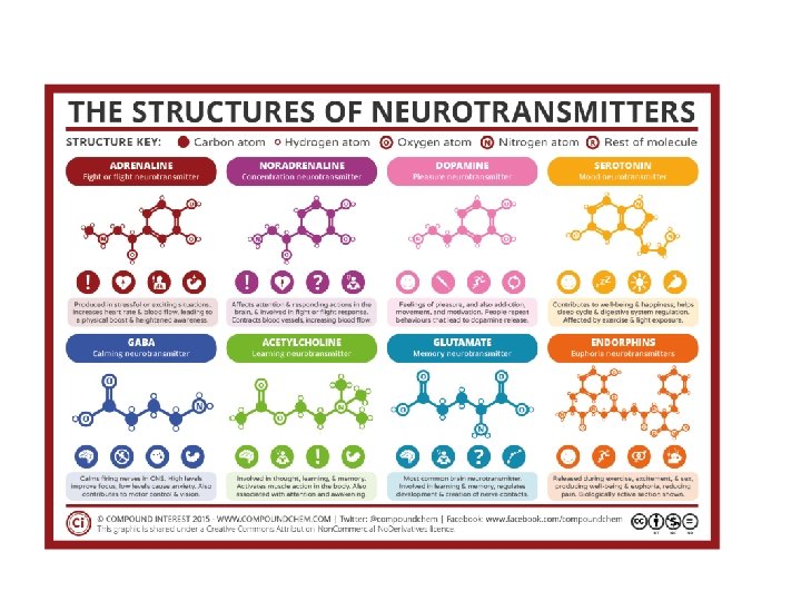 Definitions • A neurotransmitter is a chemical released at a synapse. • An example of a neurotransmitter is dopamine • The function of a neurotransmitter is to play an important role in synaptic transmission. As the electrical impulse (action potential) arrives at the axon terminal it cannot cross the gap (synaptic cleft) so a neurotransmitter is released in order to continue the synaptic transmission. • An excitatory neurotransmitter is a chemical that makes it more likely that the post synaptic neuron will fire. • An example is dopamine • An inhibitory neurotransmitter is one that calms the activity in the brain and makes the post synaptic neuron less likely to fire. • An example is GABA