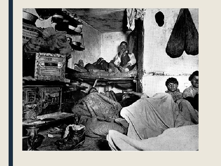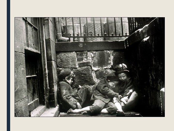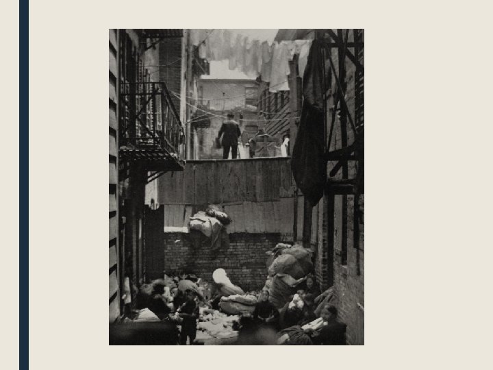 Jacob Riis’ “how the other half lives” • In 1890, Jacob Riis published “How the Other Half Lives”. • Book contained photographs of the despicable living conditions of urban poor forced to live in crowded tenements. • Brought reform to many of urban America’s poorest neighborhoods.