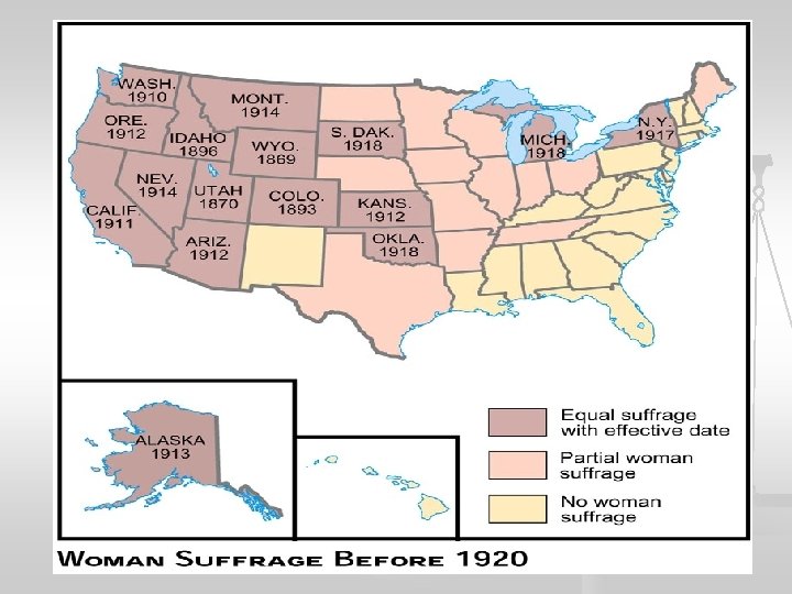 THREE-PART STRATEGY FOR WINNING SUFFRAGE n Suffragists tried three approaches to winning the vote n n n 1) Convince state legislatures to adopt vote (Succeeded in Wyoming, Utah, Idaho, Colorado). 2) Pursue court cases to test 14 th Amendment. 3) Push for national constitutional Amendment.