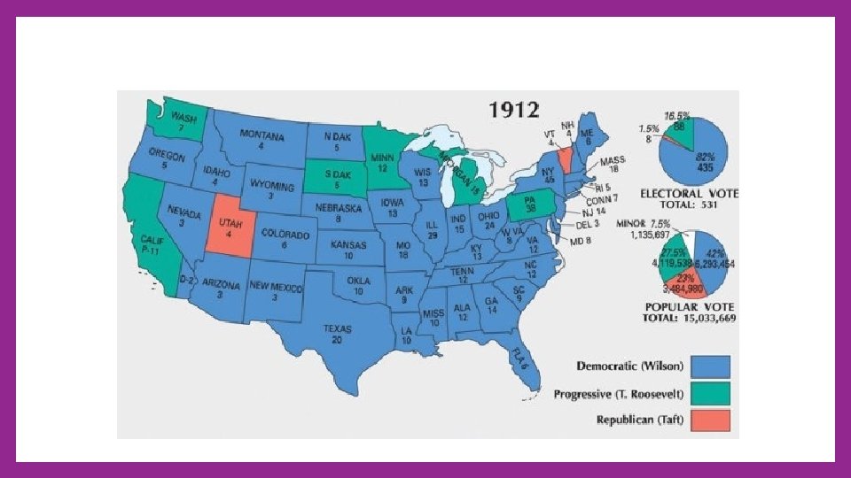 Election of 1912 • Taft – Republican Party • Debs – Socialist Party • Wilson – Democratic Party • New Freedom from corporate corruption and increased competition- no tariffs, graduated income tax • Temporary gov control in order to break up trusts • Support small business • • T. Roosevelt – Bull Moose Party • New Nationalism Control and heavily regulate big business • Higher taxes, labor and health laws, various insurance laws • Women’s suffrage •