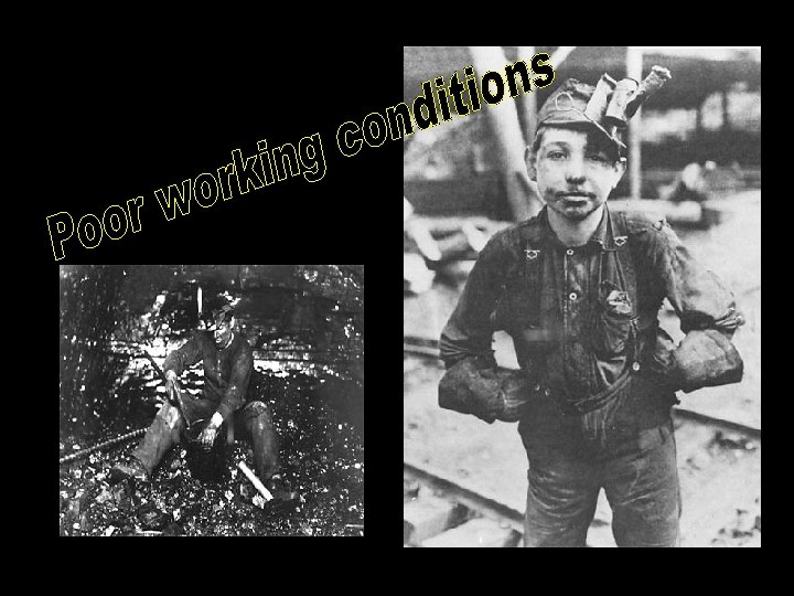 Example: Steel workers worked 12 hours a day, 7 days a week Textile workers worked 60 to 84 hours a week (primarily women and children) NO Unemployment insurance NO workman’s compensation FEW pension plans Worksites unsafe child labor freely permitted