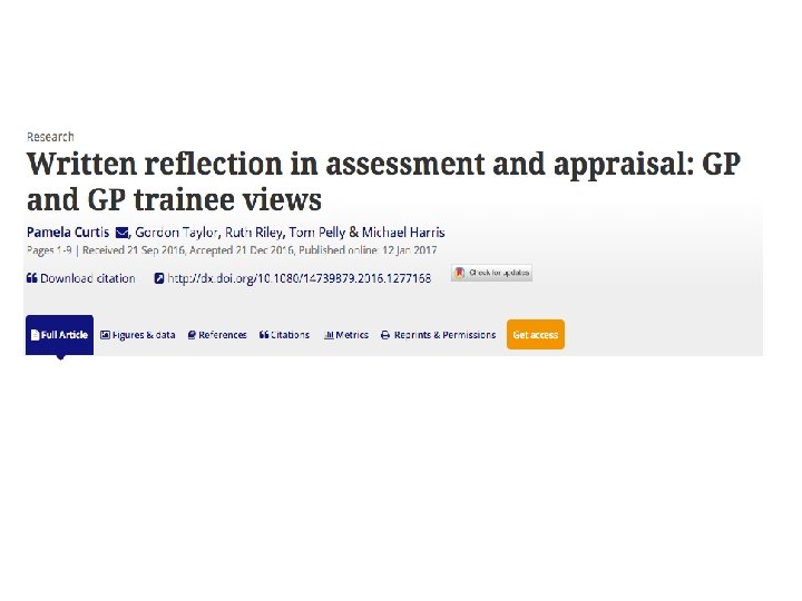 What they said… 540 GPs and 460 GPSTs • 83% prefer verbal reflection with colleagues to written reflection • 70% agree: time consuming, box ticking, distracts from learning • 75% do not think useful for identifying poorly performing GPs
