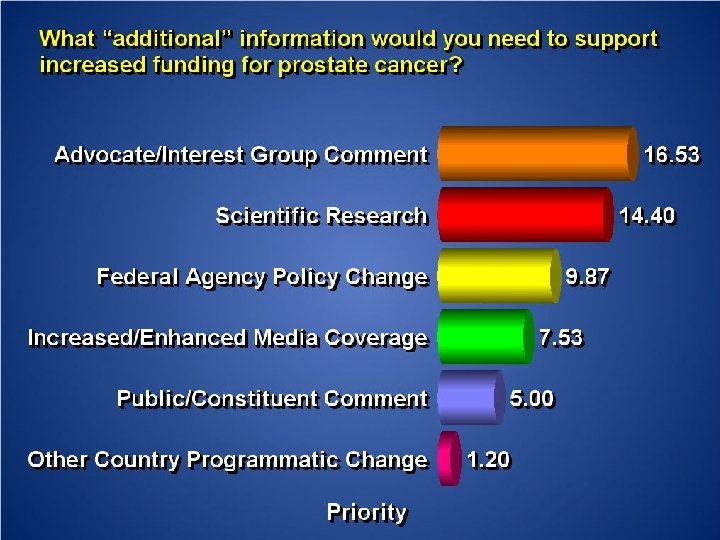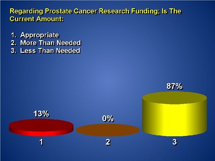 Registered Attendance § On-Site - 93: § U. S. Congressman - 1 § Congressional Legislative Staff - 26 § Patients/Advocates - 25 § Healthcare Professionals: § Medical Oncologists - 4 § Urologists - 3 § Cancer Researchers - 23 § Pharmaceutical Industry - 7 § Follow-up plans: § Meetings being scheduled with Congressional Members of: § Appropriations Committee § Ways and Means Committee § Partnering with Dept. of Defense Research Grantees to present evidence for increased research funding and preventive education programs
