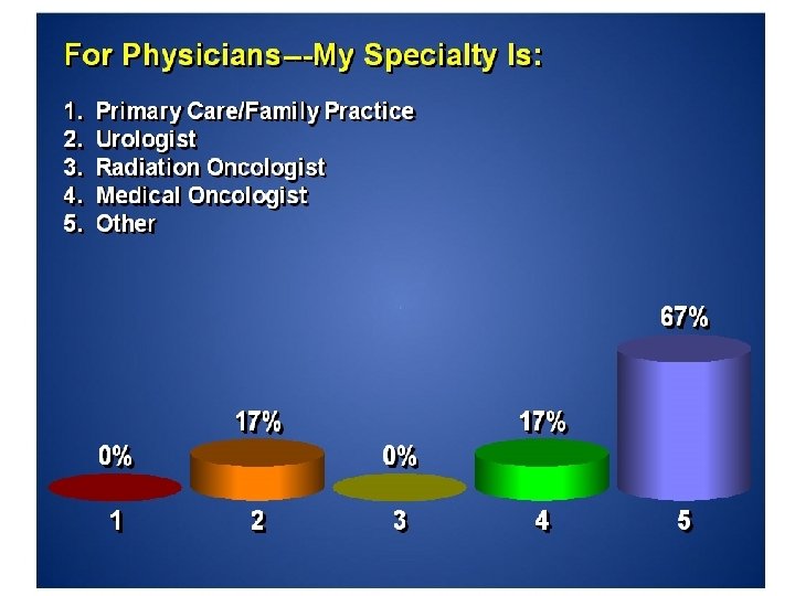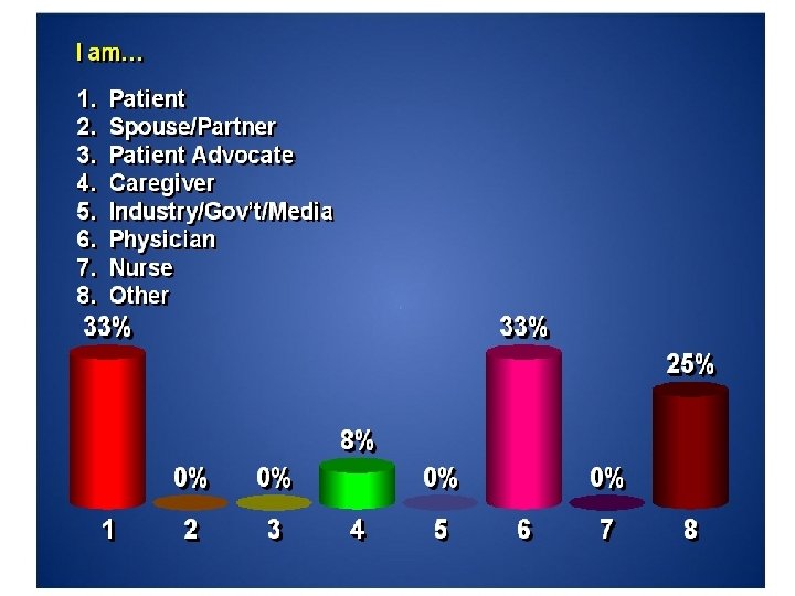 Registered Attendance § Patients/spouses, Advocates, Caregivers § On-Site: 68 § Patients - 54 § Advocates - 14 § Follow-on distribution - 107: § Through Georgia Men’s Health Coalition § Prostate Net Barbershop Initiative™ § Doctors: On-Site: 17 § § § Medoncs - 8 Radoncs - 1 Primary Care - 0 Urologists - 8 Public Health Agencies On-Site: 59 § Nurses and medical assistants - 22 § Community outreach workers - 37 § Cancer Researchers On-Site: 22 § Center for Cancer Research and Therapeutic Development - 17 § Morehouse School of Medicine - 3 § Centers for Disease Control and Prevention - 2 § Follow-on distribution - 56: § Urologists - 26 § Medoncs - 3 § Rad. Oncs - 3 § NP/PAs - 8 § Medical Centers/Public health agencies - 16