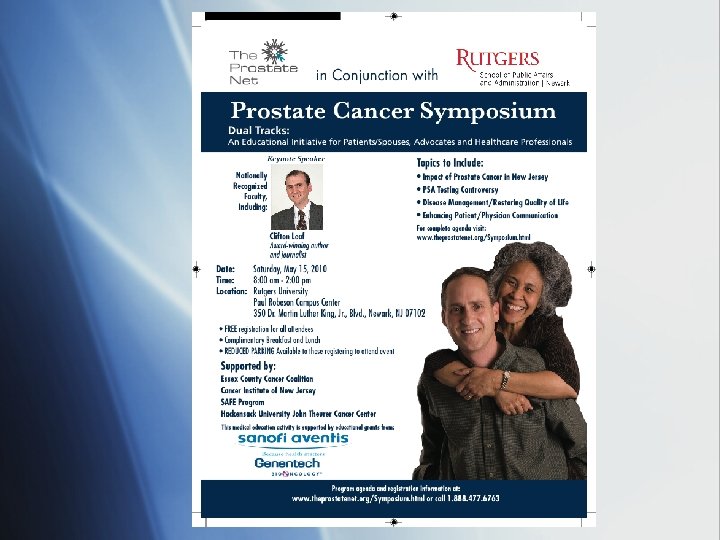 On-Going Educational Reinforcement § Archives of all Symposium Presentations are accessible through an Information Portal at: http: //prostatenet. com/page/ § Data capture of viewer demographics for future targeting § Opportunity to poll database for response on key disease issues