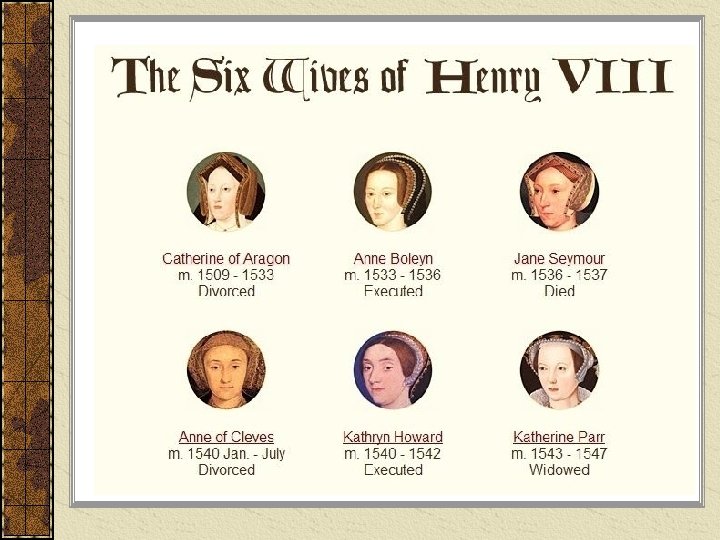 In England, the Reformation began with the King! King Henry VIII – He wants a SON!. – First wife has a daughter, Henry wants a divorce – Divorce is not permitted by Catholic church, and when the church refuses to grant Henry an exception, he breaks from the Church and forms his own church, the Church of England. – Same as catholic church except for two things • 1) They allow divorce • 2) King is head of church rather than pope