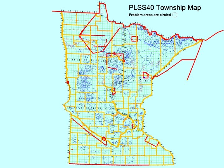 Public Land Survey System (PLSS) in Minnesota • Original Survey from 1847 to 1907 • Surveyed in the 4 th and 5 th Principals Meridians. • 8 Correction lines in the 4 th P. M. • 6 Guide Meridians & 15 Standard Parallels in the 5 th P. M. • T 26 to 71 N – R 1 to 32 W in the 4 th P. M. • T 61 to 65 N – R 1 to 7 E in the 4 th P. M. • T 101 to 168 N – R 3 to 49 W in the 5 th P. M. • One Half Township – T 58½N, R 17 W • Two Half Ranges – T 159 N, R 42½W & T 160 N, R 42½W • Contains ~ 2530 Townships • ~ 84, 000 Sections • ~ 1, 300, 000 Government Lots and 40’s (Quarter-Quarter sections) • ~ 53, 000 acres of land