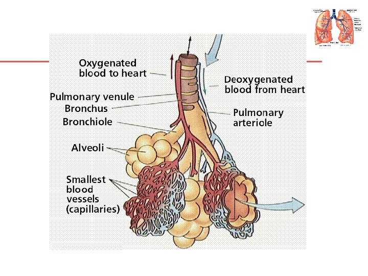 Respiration l Bronchioles l l further branching Alveolar sacs (300 million) l l l Each alveoli is surrounded by a network or covering of capillaries. Almost forms a “sheet” of blood. At rest, a single blood cell passes by 2 or 3 alveoli in about 0. 5 to 1. 0 seconds