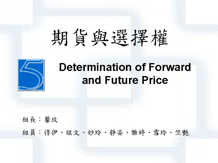 5. 4 Forward price for an investment asset 投資資產的期貨價格 • The easiest forward contract to value is one written on an investment asset that provides the holder with no income. • Non-dividend-paying stocks and zerocoupon bonds are examples of such investment assets