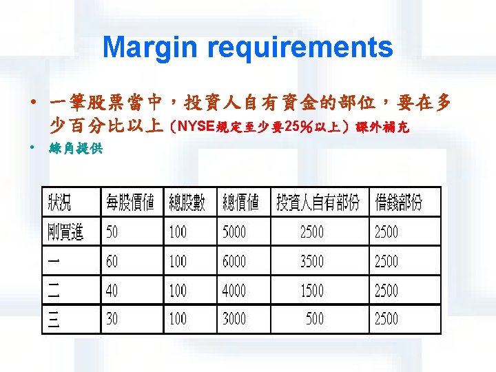 Short sale of shares • April: Borrow 500 shares and sell them for 120 +60000 • May: Pay dividend - $500 • July: Buy 500 shares for $100 per share -$50000 • Replace borrowed shares to close short position • 償還,歸還向顧客所借的股票 • Net profit= +$9500 • P 100投資人那一方