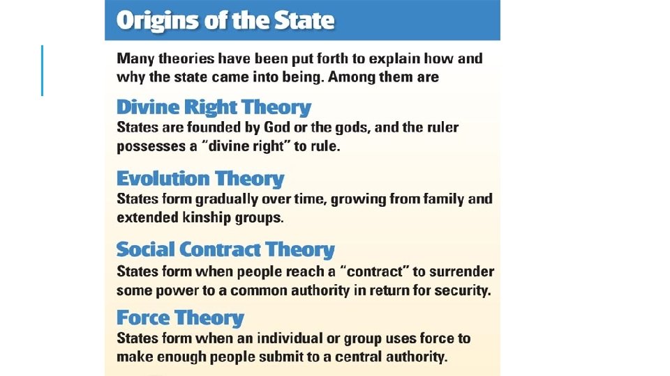 THEORIES OF RULE Divine Right • Ruler is believed to be chosen by God or the gods • Believed in ancient China, ancient Egypt, the Inca Empire, the Roman Empire, Japan until the midtwentieth century, and seventeenth-century Europe • European political and religious theory by Bossuet argued for the divine right of kings