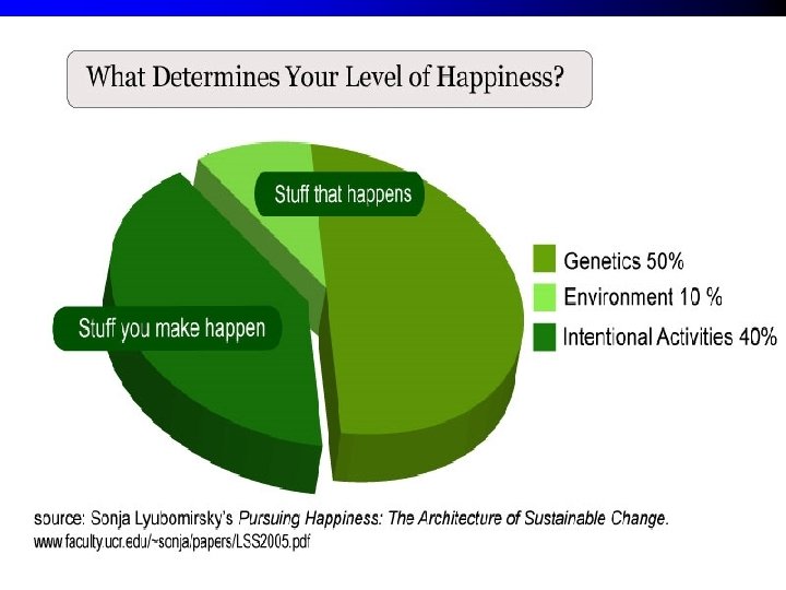 HAPPINESS IS PART GENETIC Twin studies reveal that genes account for around 50 -60% of variation in happiness. This is partly mediated by personality traits such as emotional stability, extraversion and conscientiousness.