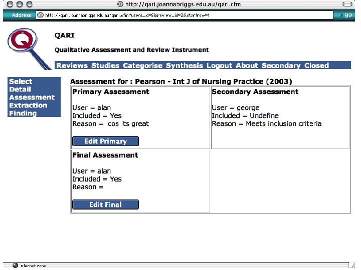 The Qualitative Assessment and Review Instrument (QARI) Designed to provide a systematic process mirroring that taken for systematic reviews of quantitative research, whilst being sensitive to the nature of qualitative data.