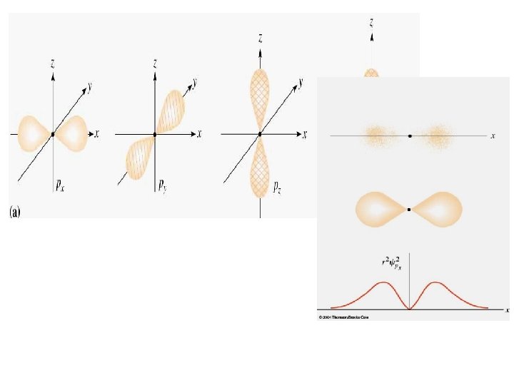 The Three p Orbitals -There are three p orbital; each orbital is cylindrically symmetrical with respect to rotation around one of the 3 axes, x, y, or z Each ‘p’ orbital has two lobes of high probability density separated by a node (region of zero probability)
