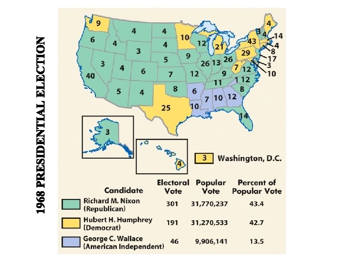 Election ‘ 68 • Due to these events “Law and Order” becomes # 1 campaign issue. • “Middle America” / “Silent Majority” is tired and scared of unrest. • *LBJ doesn’t run to due Vietnam