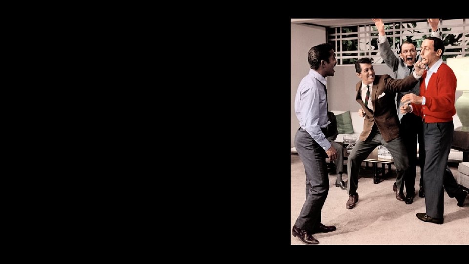 RAT PACK TIMBRES Voice Types Frank Sinatra has a baritone voice, like many other vocalists in this time period. Dean Martin sings more of a bass-baritone rather than a strict baritone. Sammy Davis Jr. on the other hand sings on the tenor side of baritone, with a very nice upper register. Band Types Frank Sinatra often sang with Count Basie’s band, especially in most of his midolder recordings. Most were what I would call extended Big Bands which would consist of the usual Saxes, Bones, Trumpets, and Rhythm section, but would add other families, such as double reeds, and other low and high brass. Dean Martin would sing with anything from the Big Dance bands, to a European group that would include acoustic guitar, violin, horns and an accordion. Sammy Davis Jr. sang with primarily big band, and would often do a tune with his drummer. Styles Frank Sinatra liked to sing in a medium swing. He also enjoyed ballads. He liked his tempos cool. Very Nat King Colesque. Dean Martin was similar to Sinatra in that he liked to sing a medium swing. Sammy Davis Jr. was a high energy person and liked to keep his songs that way. Even with his ballads, he kept a high energy.