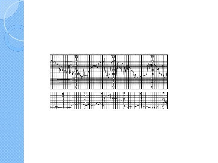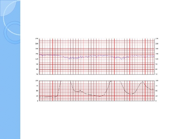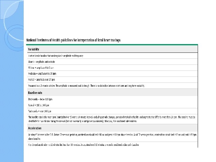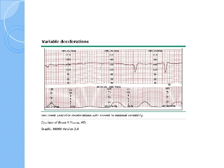 Bradycardia � Bradycardia with absent variability appears as a smooth FHR below 110 bpm. �It is ominous when it occurs for a prolonged period of time (ie, at least 10 minutes) in the absence of hypothermia, complete heart block, or use of certain drugs (eg, beta-adrenergic blockers, paracervical block). �When the FHR falls below 100, tissue perfusion may not be adequate; this degree of bradycardia is nonreassuring