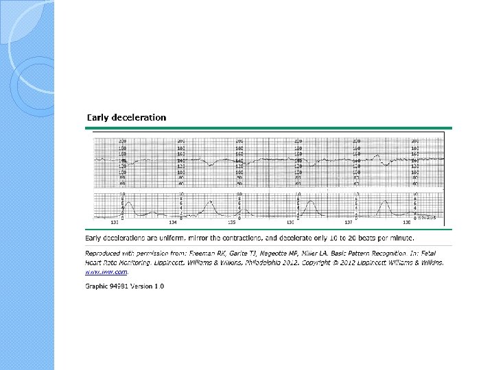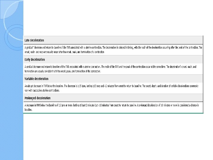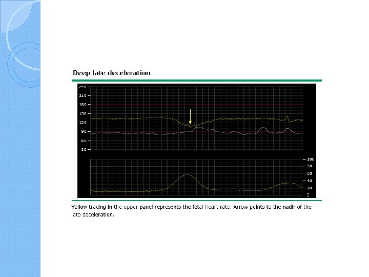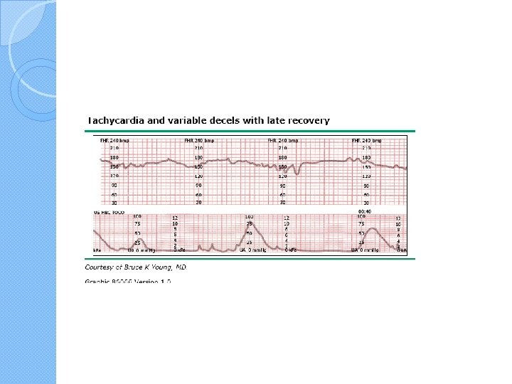 Recurrent late decelerations � They can be associated with a falling fetal p. H and perinatal morbidity and �Recurrent late decelerations (ie, occurring with ≥ 50 percent of contractions in a 20 -minute segment) with absent variability are especially predictive of current or impending fetal acidosis due to progressively falling p. H