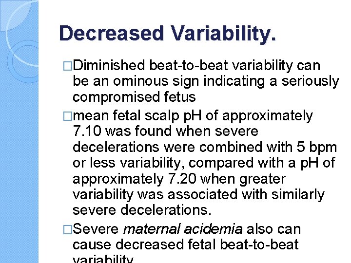 Decreased Variability. �Diminished beat-to-beat variability can be an ominous sign indicating a seriously compromised fetus �mean fetal scalp p. H of approximately 7. 10 was found when severe decelerations were combined with 5 bpm or less variability, compared with a p. H of approximately 7. 20 when greater variability was associated with similarly severe decelerations. �Severe maternal acidemia also can cause decreased fetal beat-to-beat