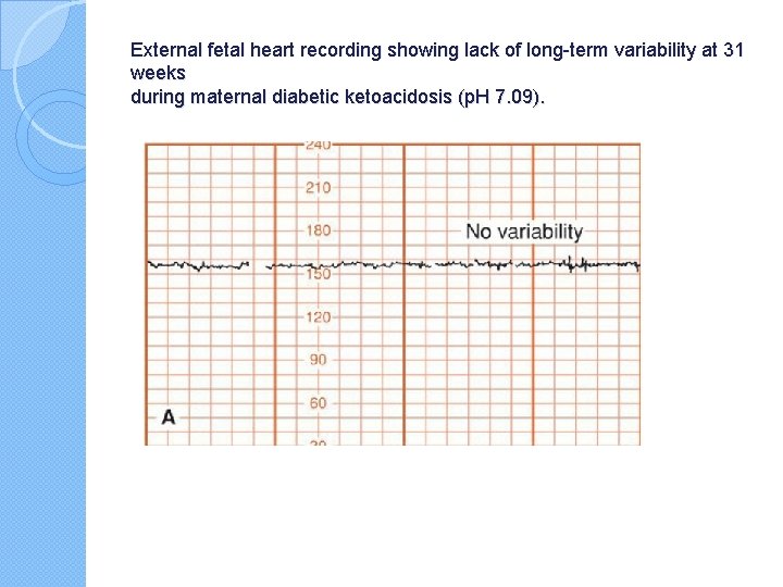 External fetal heart recording showing lack of long-term variability at 31 weeks during maternal diabetic ketoacidosis (p. H 7. 09).
