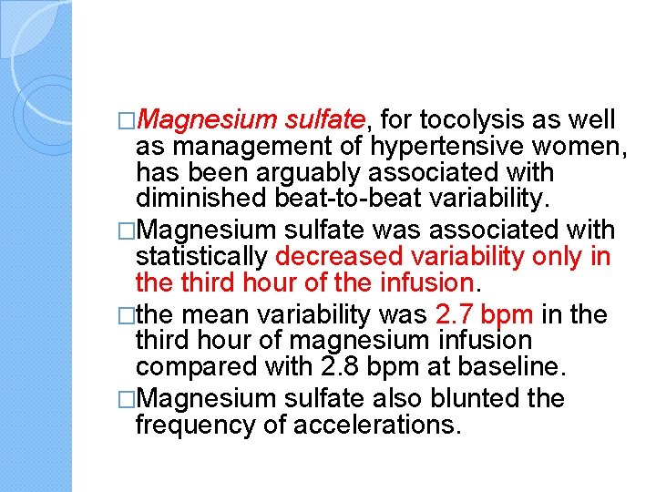 �Magnesium sulfate, for tocolysis as well as management of hypertensive women, has been arguably associated with diminished beat-to-beat variability. �Magnesium sulfate was associated with statistically decreased variability only in the third hour of the infusion. �the mean variability was 2. 7 bpm in the third hour of magnesium infusion compared with 2. 8 bpm at baseline. �Magnesium sulfate also blunted the frequency of accelerations.