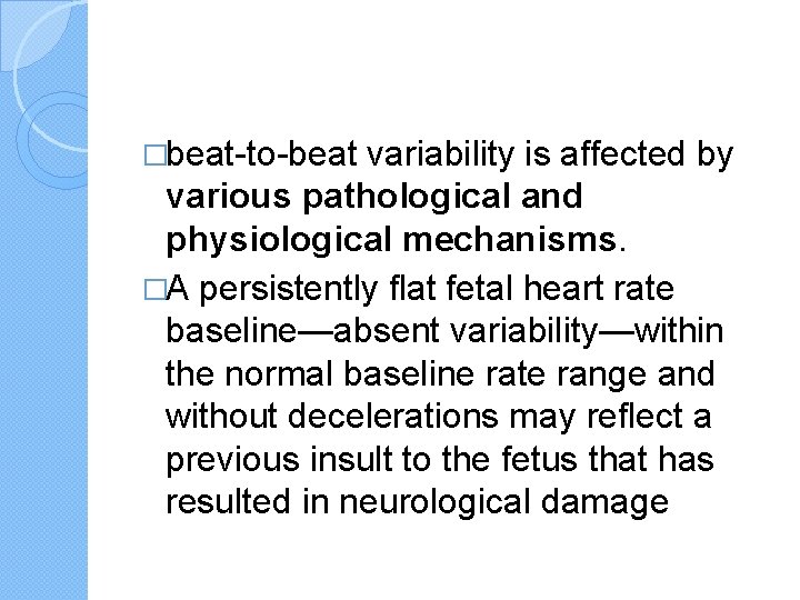 �beat-to-beat variability is affected by various pathological and physiological mechanisms. �A persistently flat fetal heart rate baseline—absent variability—within the normal baseline rate range and without decelerations may reflect a previous insult to the fetus that has resulted in neurological damage