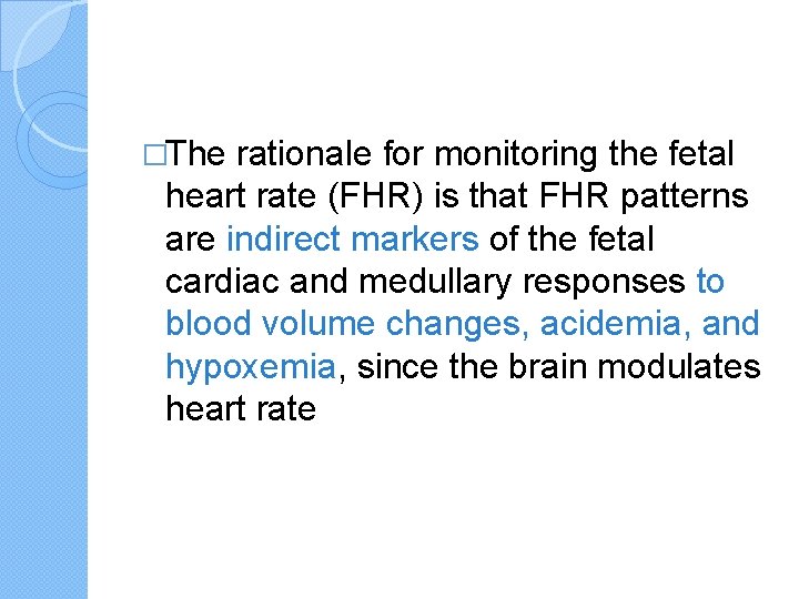 �The rationale for monitoring the fetal heart rate (FHR) is that FHR patterns are indirect markers of the fetal cardiac and medullary responses to blood volume changes, acidemia, and hypoxemia, since the brain modulates heart rate