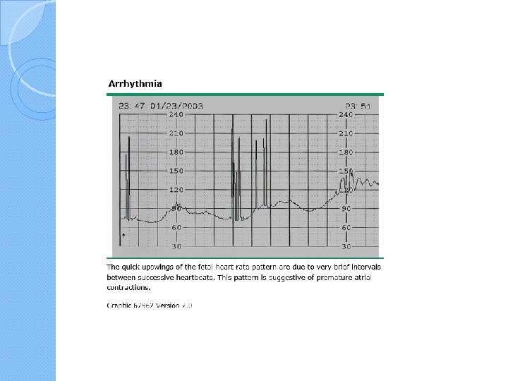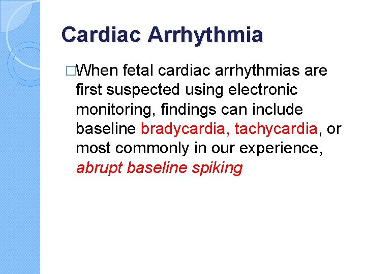 Cardiac Arrhythmia �When fetal cardiac arrhythmias are first suspected using electronic monitoring, findings can include baseline bradycardia, tachycardia, or most commonly in our experience, abrupt baseline spiking