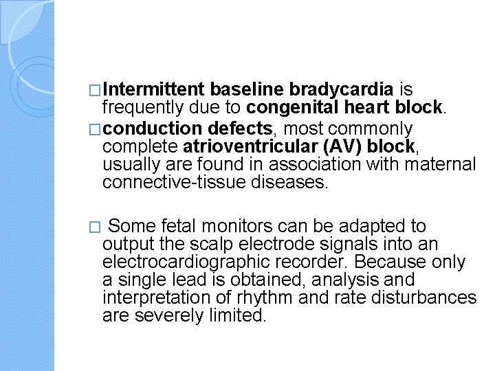 �Intermittent baseline bradycardia is frequently due to congenital heart block. �conduction defects, most commonly complete atrioventricular (AV) block, usually are found in association with maternal connective-tissue diseases. � Some fetal monitors can be adapted to output the scalp electrode signals into an electrocardiographic recorder. Because only a single lead is obtained, analysis and interpretation of rhythm and rate disturbances are severely limited.