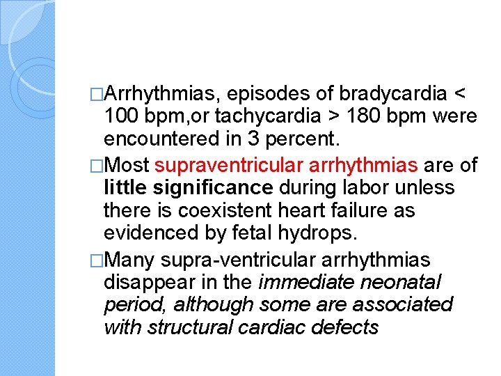�Arrhythmias, episodes of bradycardia < 100 bpm, or tachycardia > 180 bpm were encountered in 3 percent. �Most supraventricular arrhythmias are of little significance during labor unless there is coexistent heart failure as evidenced by fetal hydrops. �Many supra-ventricular arrhythmias disappear in the immediate neonatal period, although some are associated with structural cardiac defects