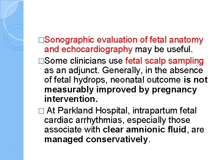 �Sonographic evaluation of fetal anatomy and echocardiography may be useful. �Some clinicians use fetal scalp sampling as an adjunct. Generally, in the absence of fetal hydrops, neonatal outcome is not measurably improved by pregnancy intervention. � At Parkland Hospital, intrapartum fetal cardiac arrhythmias, especially those associate with clear amnionic fluid, are managed conservatively.