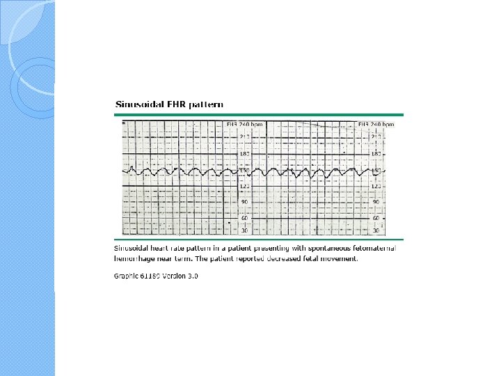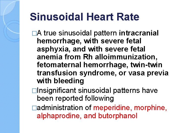 Sinusoidal Heart Rate �A true sinusoidal pattern intracranial hemorrhage, with severe fetal asphyxia, and with severe fetal anemia from Rh alloimmunization, fetomaternal hemorrhage, twin-twin transfusion syndrome, or vasa previa with bleeding �Insignificant sinusoidal patterns have been reported following �administration of meperidine, morphine, alphaprodine, and butorphanol