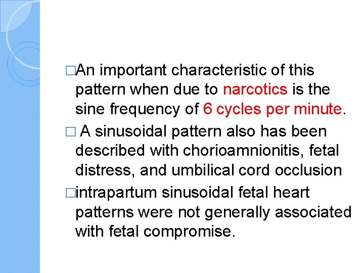 �An important characteristic of this pattern when due to narcotics is the sine frequency of 6 cycles per minute. � A sinusoidal pattern also has been described with chorioamnionitis, fetal distress, and umbilical cord occlusion �intrapartum sinusoidal fetal heart patterns were not generally associated with fetal compromise.