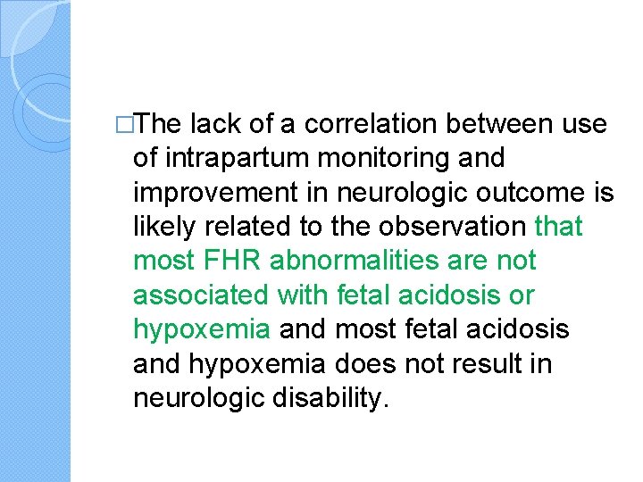 �The lack of a correlation between use of intrapartum monitoring and improvement in neurologic outcome is likely related to the observation that most FHR abnormalities are not associated with fetal acidosis or hypoxemia and most fetal acidosis and hypoxemia does not result in neurologic disability.