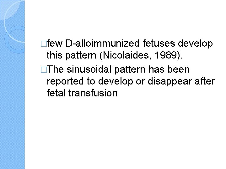 �few D-alloimmunized fetuses develop this pattern (Nicolaides, 1989). �The sinusoidal pattern has been reported to develop or disappear after fetal transfusion