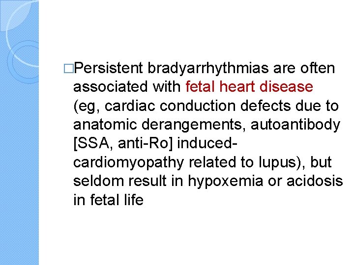 �Persistent bradyarrhythmias are often associated with fetal heart disease (eg, cardiac conduction defects due to anatomic derangements, autoantibody [SSA, anti-Ro] inducedcardiomyopathy related to lupus), but seldom result in hypoxemia or acidosis in fetal life