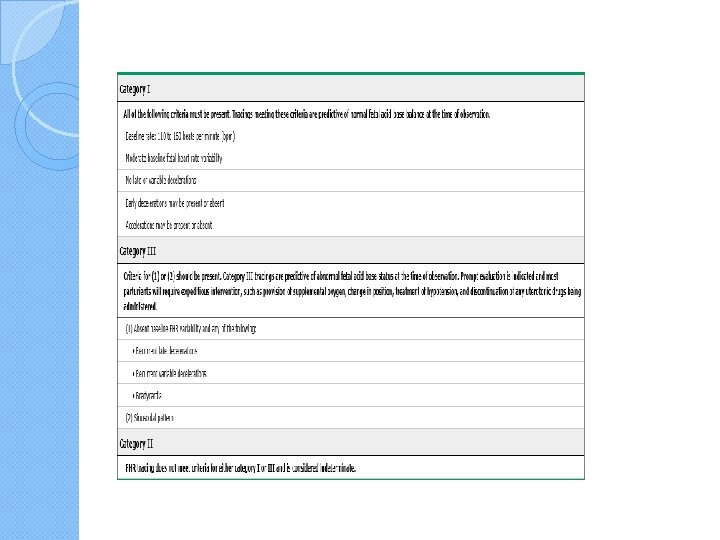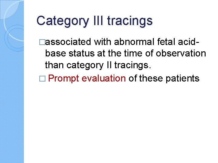 Category III tracings �associated with abnormal fetal acid- base status at the time of observation than category II tracings. � Prompt evaluation of these patients