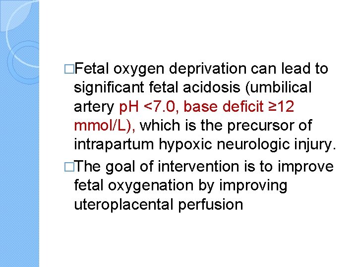 �Fetal oxygen deprivation can lead to significant fetal acidosis (umbilical artery p. H <7. 0, base deficit ≥ 12 mmol/L), which is the precursor of intrapartum hypoxic neurologic injury. �The goal of intervention is to improve fetal oxygenation by improving uteroplacental perfusion