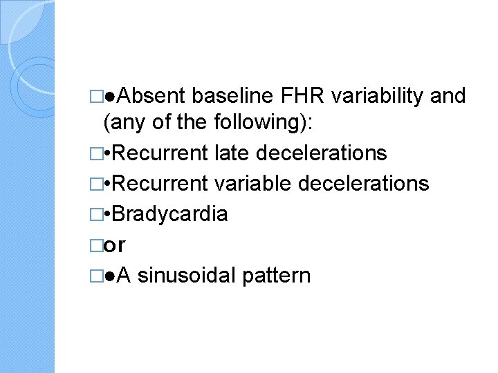 �●Absent baseline FHR variability and (any of the following): � • Recurrent late decelerations � • Recurrent variable decelerations � • Bradycardia �or �●A sinusoidal pattern