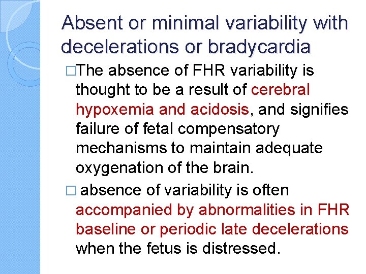 Absent or minimal variability with decelerations or bradycardia �The absence of FHR variability is thought to be a result of cerebral hypoxemia and acidosis, and signifies failure of fetal compensatory mechanisms to maintain adequate oxygenation of the brain. � absence of variability is often accompanied by abnormalities in FHR baseline or periodic late decelerations when the fetus is distressed.