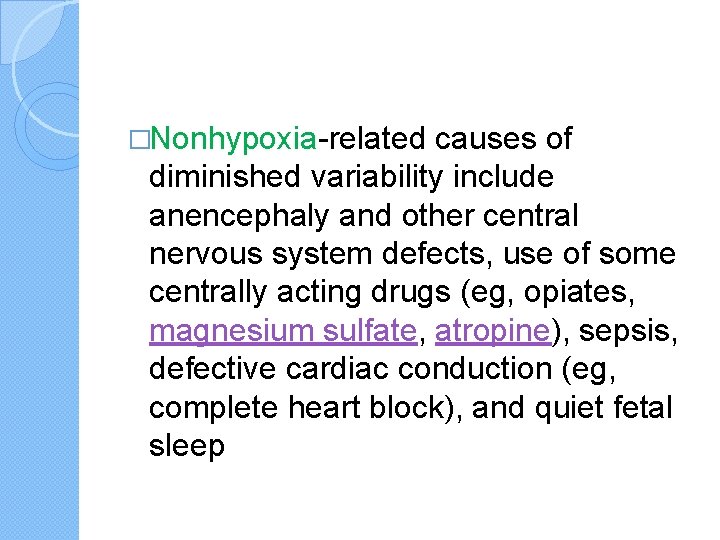 �Nonhypoxia-related causes of diminished variability include anencephaly and other central nervous system defects, use of some centrally acting drugs (eg, opiates, magnesium sulfate, atropine), sepsis, defective cardiac conduction (eg, complete heart block), and quiet fetal sleep