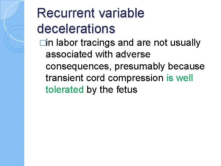 Recurrent variable decelerations �in labor tracings and are not usually associated with adverse consequences, presumably because transient cord compression is well tolerated by the fetus