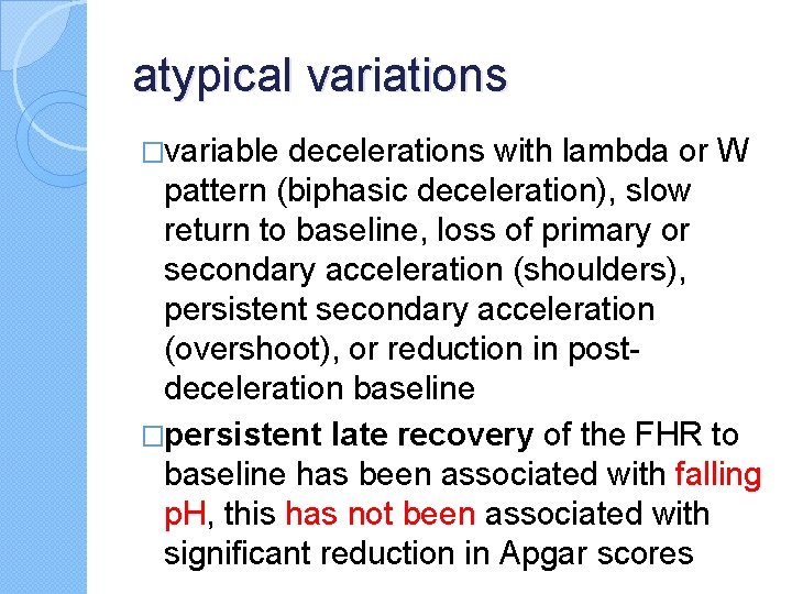 atypical variations �variable decelerations with lambda or W pattern (biphasic deceleration), slow return to baseline, loss of primary or secondary acceleration (shoulders), persistent secondary acceleration (overshoot), or reduction in postdeceleration baseline �persistent late recovery of the FHR to baseline has been associated with falling p. H, this has not been associated with significant reduction in Apgar scores