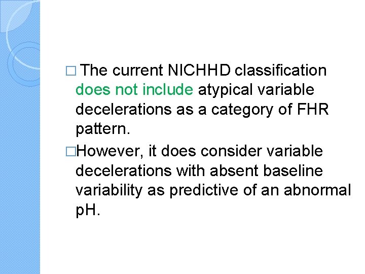� The current NICHHD classification does not include atypical variable decelerations as a category of FHR pattern. �However, it does consider variable decelerations with absent baseline variability as predictive of an abnormal p. H.