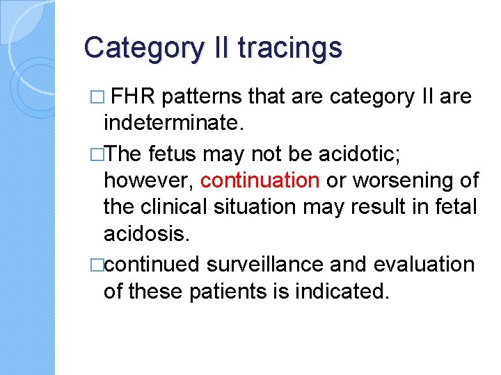 Category II tracings � FHR patterns that are category II are indeterminate. �The fetus may not be acidotic; however, continuation or worsening of the clinical situation may result in fetal acidosis. �continued surveillance and evaluation of these patients is indicated.