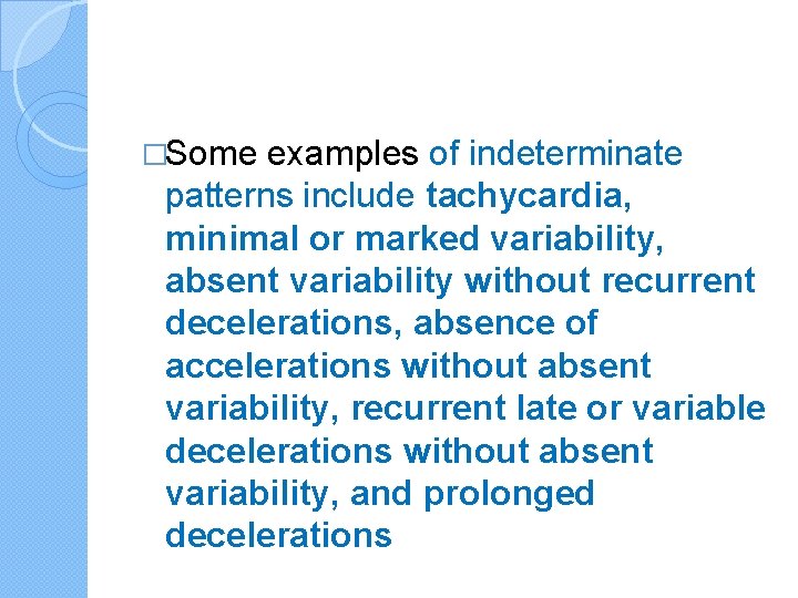 �Some examples of indeterminate patterns include tachycardia, minimal or marked variability, absent variability without recurrent decelerations, absence of accelerations without absent variability, recurrent late or variable decelerations without absent variability, and prolonged decelerations