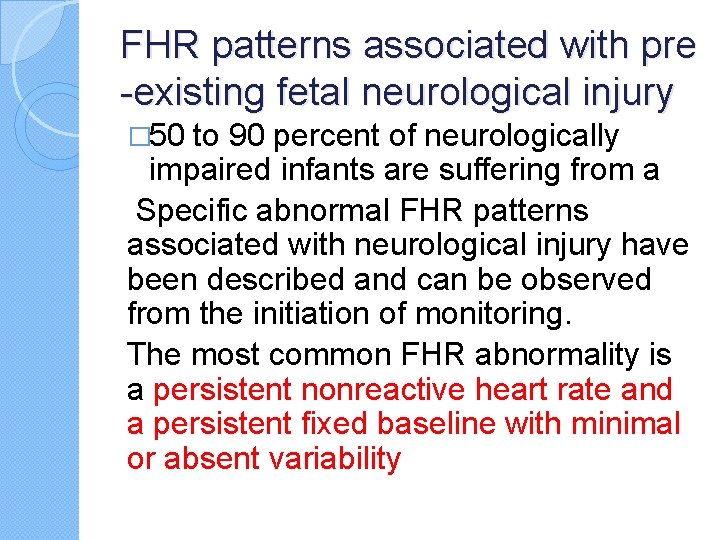 FHR patterns associated with pre -existing fetal neurological injury � 50 to 90 percent of neurologically impaired infants are suffering from a Specific abnormal FHR patterns associated with neurological injury have been described and can be observed from the initiation of monitoring. The most common FHR abnormality is a persistent nonreactive heart rate and a persistent fixed baseline with minimal or absent variability