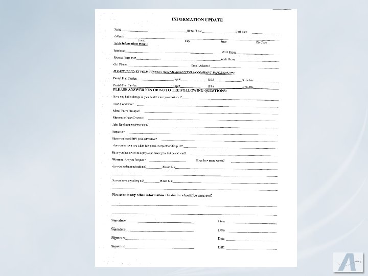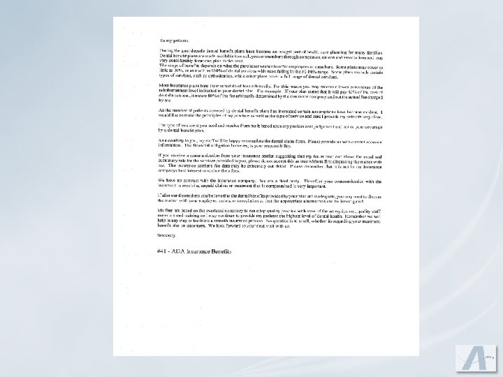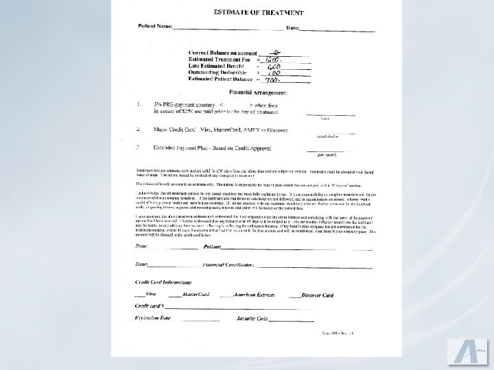 Written Financial Agreement u. Don’t break down periodontal treatment – present total fee. u. Include previous balance u. How do you expect to be paid? u. Agreement between you and the patient u. If you accept benefit assignments, what happens if you are not paid in a timely manner by their benefit company?