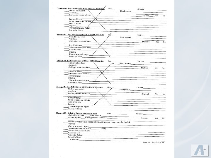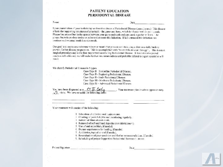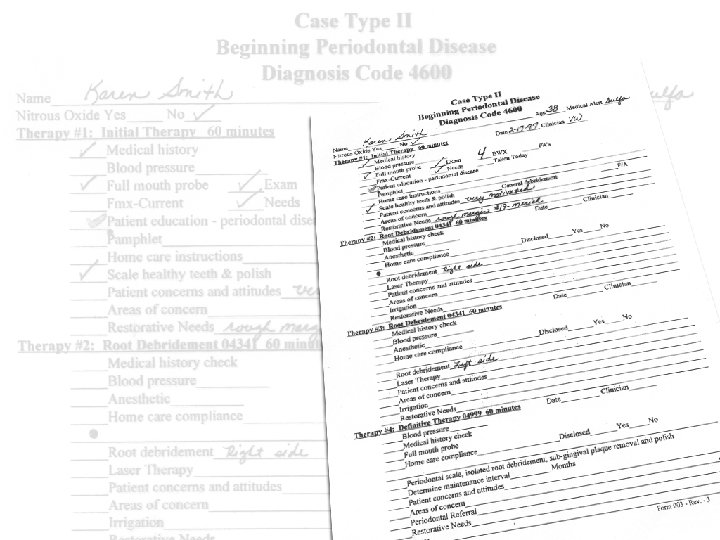 Hygienist’s Role u. Complete periodontal charting u. Bring patient into their own mouth by showing health versus disease u. Tell patient their level of disease and treatment recommendations u. Emphasize the importance of keeping appointments as scheduled for the success of their treatment