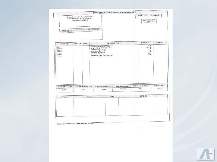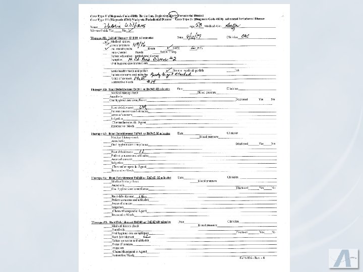 You Must Diagnose the Disease and Inform the Patient Entries should be: u Written in ink u Dated u Legible u Permanent u Signed u No alterations – If a mistake is made, draw a line through it. No liquid paper should be used. u Abbreviations are acceptable. There should be a master list of abbreviations for your office. u It is recommended to have a separate area where fees are recorded for the procedures.